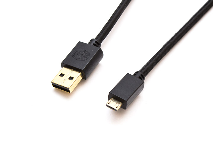 Кабель USB заключен в нейлоновую оплетку, имеет средний уровень жесткости и длину в 1,5 метра. Легко запоминает и держит заданную форму. Разъемы с обоих концов шнура позолочены. Коннектор клавиатуры — стандартный Micro USB тип B. Ферритового кольца или кабельных стяжек в комплекте не предусмотрено.