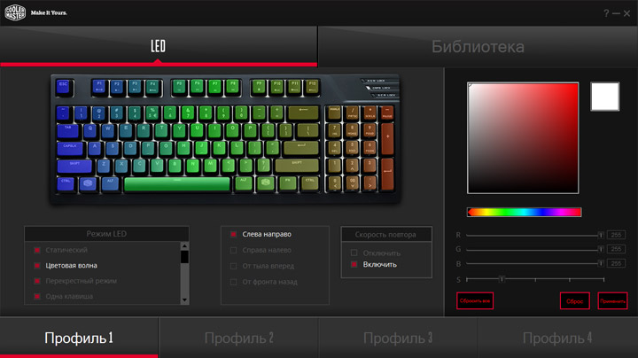 Драйвер клавиатуры не является постоянно активным, запускать его можно или из оболочки Portal, либо прямо через его собственный ярлык. Драйвер работает с памятью и процессором клавиатуры напрямую, в режиме реального времени, потому при исполнении некоторых настроек возможны кратковременные зависания, пока идет запись. Первой вкладкой, которая встречает пользователя, является раздел подсветки LED. Тут можно индивидуально настроить цвет всех кнопок, используя RGB-палитру, или выбрать для них один из множественных эффектов, настроив для него скорость воспроизведения. Все это сохраняется раздельно в четырех бортовых профилях памяти.