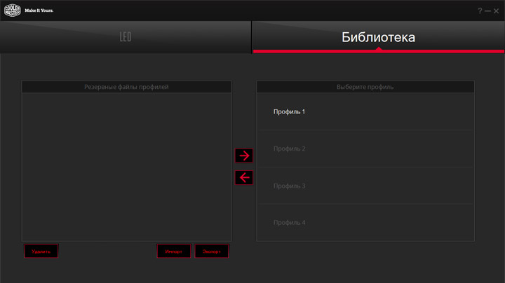 Во вкладке «Библиотека» можно импортировать или экспортировать на ПК один из четырех профилей, сохраненных в бортовой памяти.
