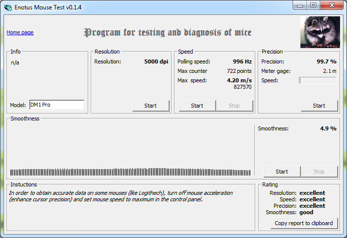 Оптический сенсор Pixart PMW 3310, установленный здесь, на сегодня относится к среднему классу датчиков, но по-прежнему неплох даже на фоне новинок. Компания слегка доработала его, увеличив максимальную скорость до 4 м/с (чтобы исключить срывы даже при использовании самыми быстрыми игрокам) и позаботилась о том, чтобы у данной мыши не было паразитных моментов в работе, в том числе дрожания, акселерации, линейности траектории и прочих недостатков. Даже максимальный уровень сглаживания не превышает в среднем 5%, и это очень хороший показатель для данного сенсора. Частота опроса датчика постоянно составляет 1000 Гц. При желании, или точнее, в случае использования на слабом ПК, мышь можно прошить на 500 Гц, скачав соответствующую программу с официального сайта. Высота отрыва зафиксирована на 1,8 мм, не слишком высоко, но и не очень низко, чтобы не было конфликта с некоторыми видами игровых поверхностей.