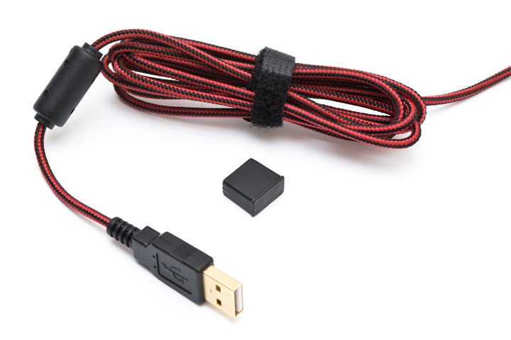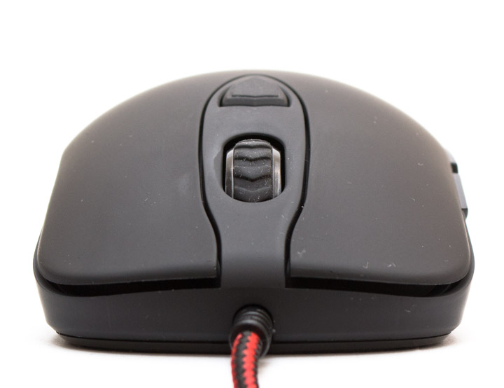 Сигнальный шнур заходит в корпус мыши посередине, защита от перегиба расположена низко относительно рабочей поверхности, потому кабель может ее задевать, и потребуется его выровнять либо использовать держатель. Колесо прокрутки сделано из прозрачного пластика и покрыто по ободу резиновой накладкой с насечками в виде стрелочек. Энкодер прокрутки мягкий и тихий, со слабо различимыми позициями фиксации. Люфт колеса незначительный. Переключатель под средней кнопкой туговат, срабатывает относительно негромко. Ресурс нажатий у него тоже составляет 3 млн. Панели основных кнопок подогнаны хорошо и не имеют запаса свободного хода.