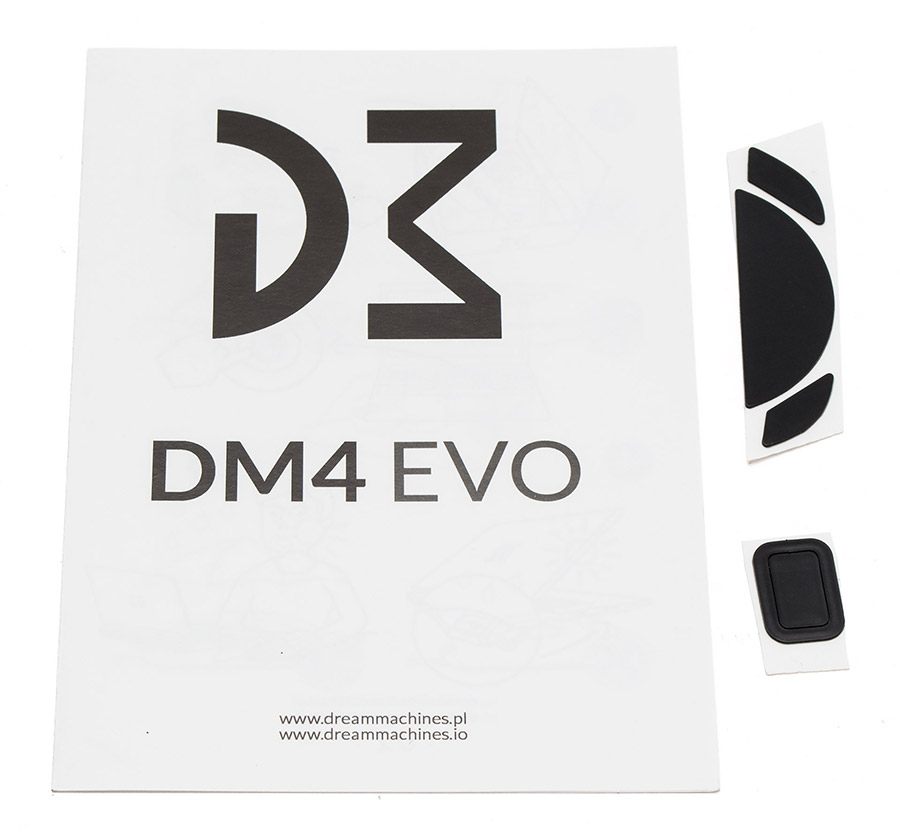 Форма корпуса Dream Machines DM4 Evo, как уже упоминалось ранее, повторяет Logitech G403 с её ассиметричной эргономикой под правую руку. Поверхность выполнена из приятного на ощупь, но очень маркого матового пластика. Панели основных клавиш отдельные, между ними расположена глянцевая вставка, в которой разместилось колесо прокрутки и кнопки переключения разрешения. ЛКМ и ПКМ имеют люфт, но лишены запаса свободного хода. Нажимаются с мягким приглушенным щелчком и средней силой активации. Под ними расположены переключатели Huano в синем корпусе с белыми отбойниками с заявленным ресурсом наработки на отказ в 20 млн. нажатий.