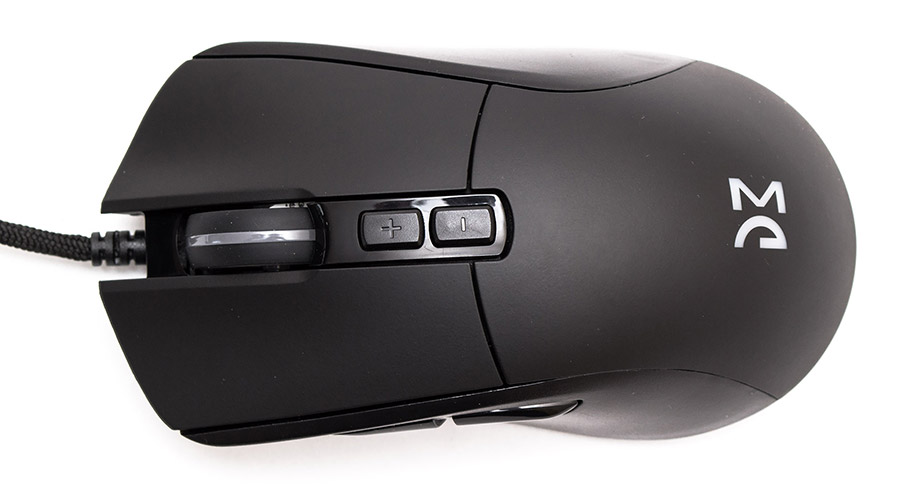 Колесо прокрутки мыши прорезинено, поверхность его ровная и лишенная тактильных насечек. Посередине и по бокам колесо сделано из прозрачного пластика, через который видно подсветку. Переключатель средней кнопки традиционно тихий и тугой. Энкодер вращается тихо, с легким потрескиванием, позиции фиксации хорошо ощутимы тактильно, люфта в механизме нет. Сигнальный кабель заходит в корпус по центру внизу, в месте входа он снабжен небольшой защитой от перегиба и затирания.