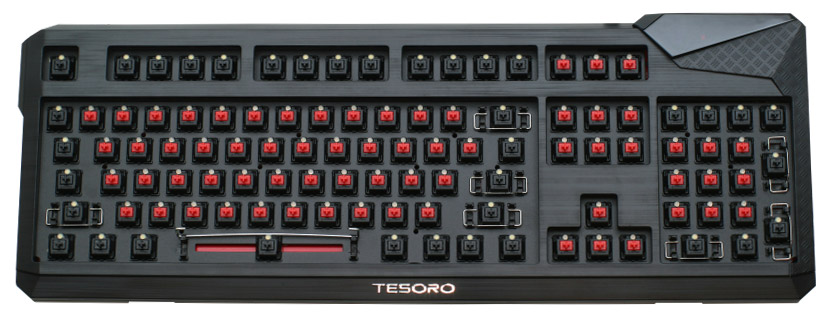 В Tesoro Durandal G1NL eSport Edition задействована гибридная система механических переключателей, что собственно и выделяет её на фоне многих игровых клавиатур. Обозреваемая модель оснащена линейными свитчерами: Cherry MX Red и MX Black. Схема их распределения в раскладке довольно простая и легко запоминающаяся. Наибольшее скопление Cherry MX Red наблюдается в зоне алфавитно-цифрового блока, части служебных клавиш, управления курсором и цифровом блоке.