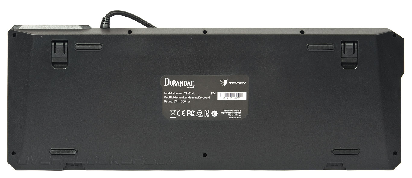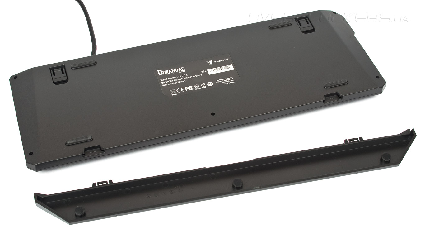 Подошвы ножек оснащены прорезиненными накладками, благодаря которым устройство надежно фиксируется в заданном положении. Дополнительный уровень сцепления обеспечивает приличная масса. Несмотря на то, что Tesoro Durandal G1NL eSport Edition целиком и полностью изготовлен из пластика, её общий вес равен 1,4 кг.