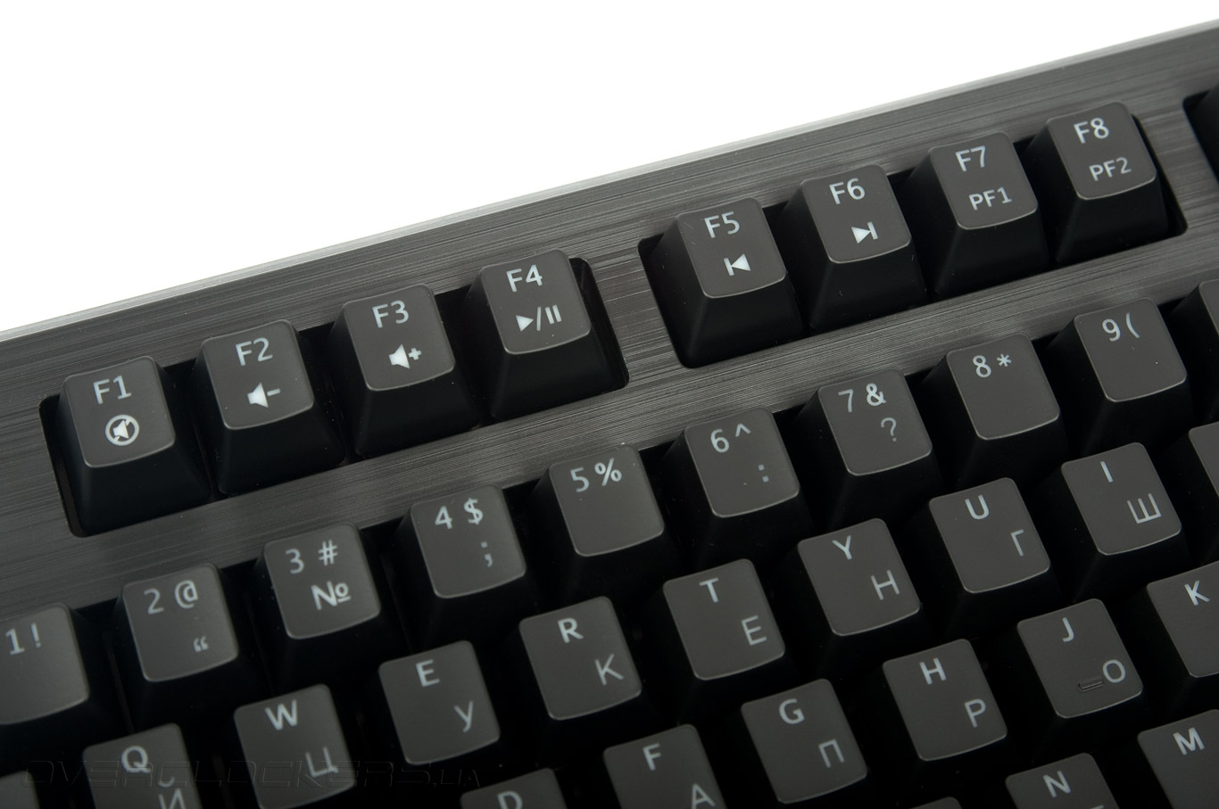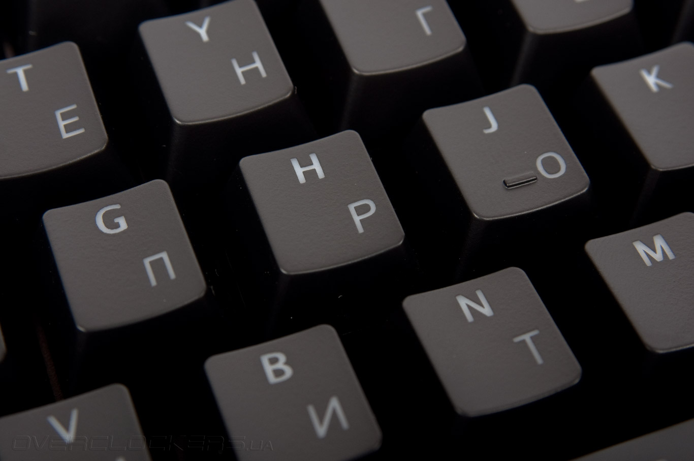 Гравировка латинских и кириллических символов произведена качественно. Хорошую читабельность латинских литер обеспечивают крупные контуры и оптимальное рассредоточение на лицевой поверхности кнопок. Латинские литеры вынесены по центру верхней зоны. Контуры кириллических символов более тонкие. Они выгравированы в нижнем левом углу кнопки. Стиль шрифта в обоих случаях остался обычным.