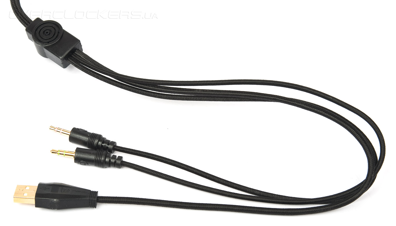 Конец основного кабеля разветвлён на два 3,5-мм штекера для подключения к аудиовыходам звуковой карты и один коннектор USB 2.0, питающий клавиатуру и подсветку. Коннекторы покрыты золотым напылением, которое, по заверению производителей компьютерной периферии, обеспечивает лучшую коммутацию.