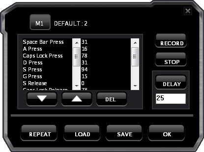 Запись макрокоманд происходит по стандартной схеме. Для начала активируется любая макро-кнопка ряда М1–М10. После того как её контур начал мигать, выбираем клавишу для программирования. В раскрывшемся списке находим действие MACRO. На следующем шаге появляется компактное окошко, где прописывается комбинация клавиш и выставляются временные задержки.