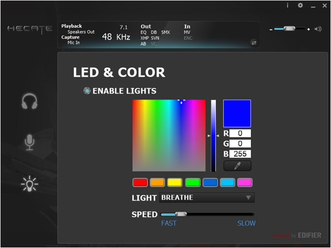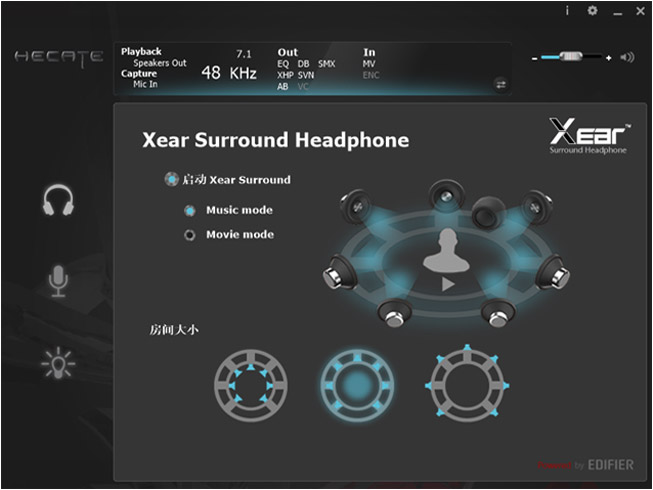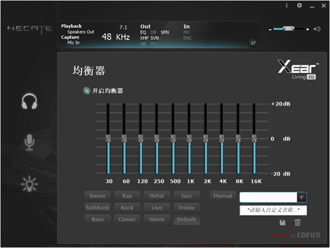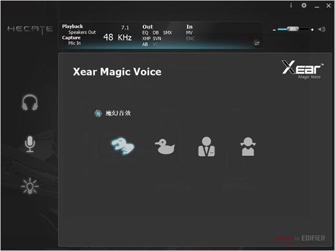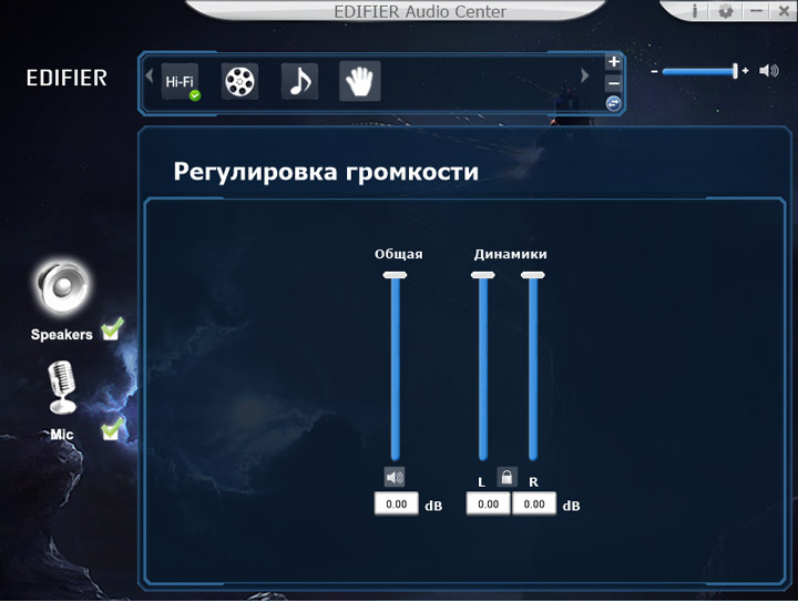 Наушники Edifier Hecate G4 работают с фирменной программой Edifier Audio Center. Она многофункциональна, но выглядит устаревшей. Особенно раздражает вызов меню с помощью клика правой кнопки мыши по значку микрофона или динамика. Приложение позволяет усилить звук микрофона или наложить на голос эффекты звучания. Программа точно подстраивает объёмный звук 7.1, а с динамиками можно использовать заготовленные пресеты для прослушивания музыки, просмотра кино, игр и прочего.