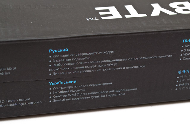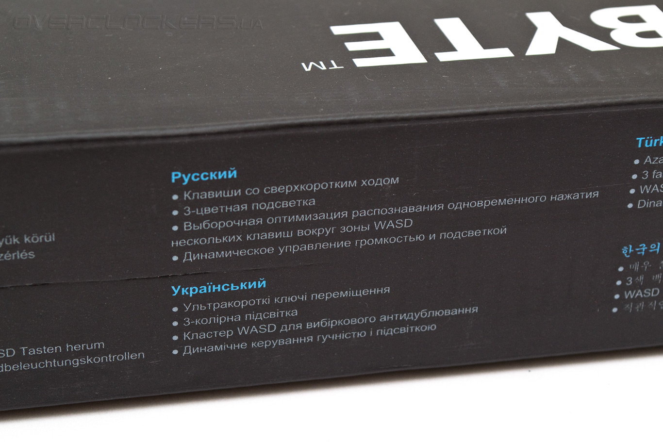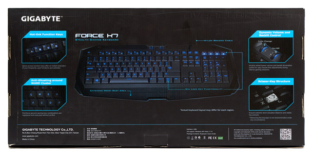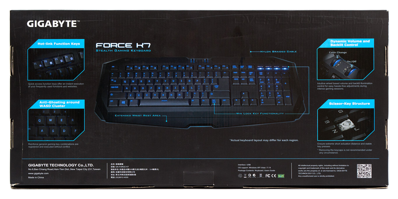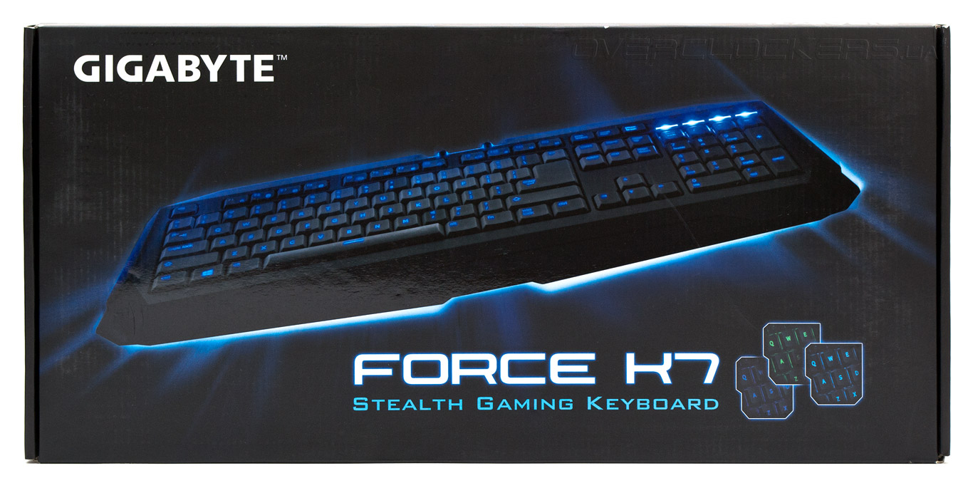 Поставляется Gigabyte Force K7 в симпатичной с виду коробке, стильно сочетающей синие и черные элементы оформления с белыми шрифтами. На фронтальной стороне нанесено реалистичное изображение продукта и содержится указание на то, что данная клавиатура относится к классу Stealth, то есть — обещает быть тихой и незаметной. Ну что же, это частично объясняет, почему был выбран именно ножничный механизм клавиш, действительно отличающийся крайне низким уровнем шума.