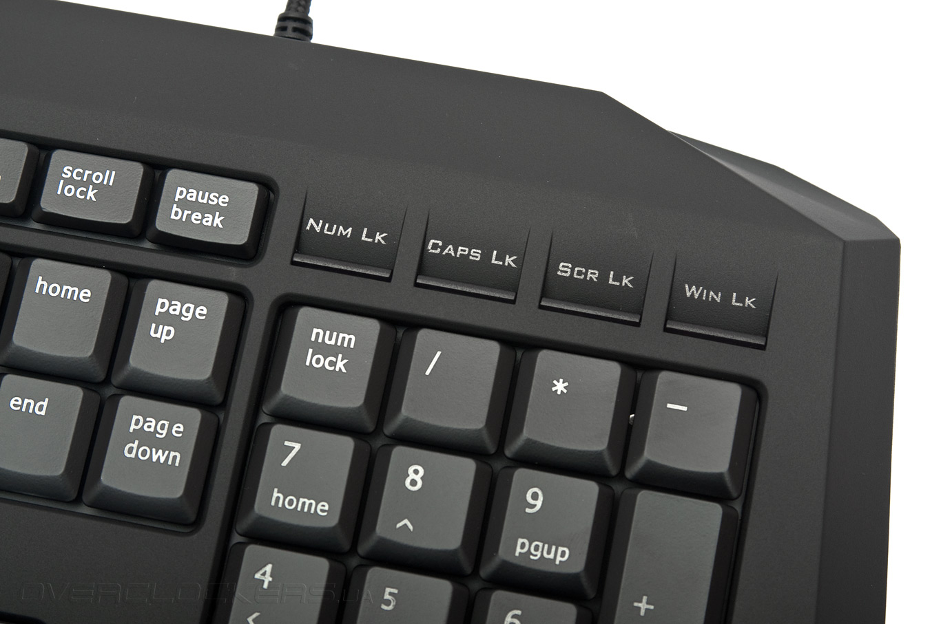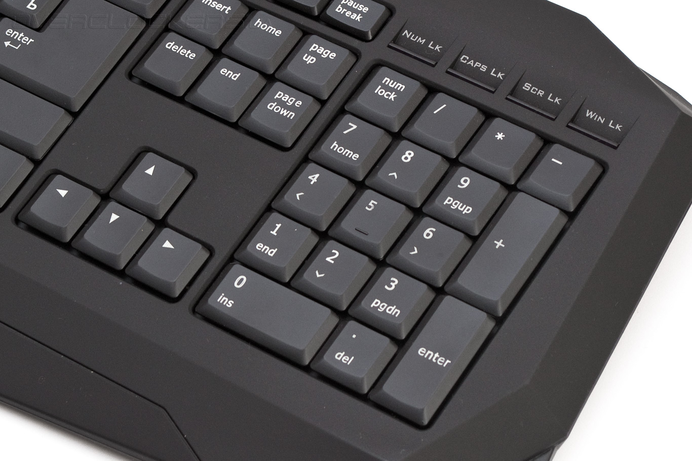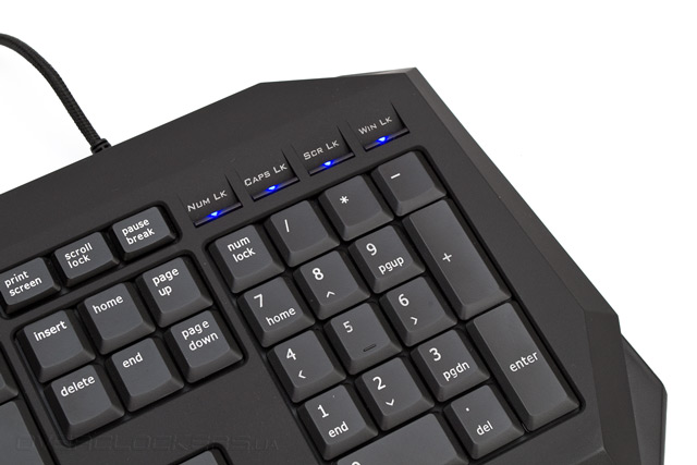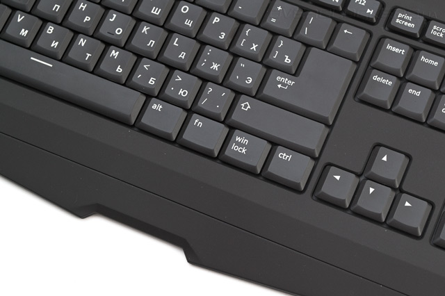 Четыре информационных светодиода сделаны в виде стильных бойниц. Помимо трех стандартных индикаторов справа пристроился светодиод, обозначающий включение функции Winlock.