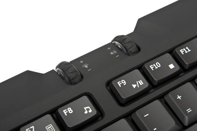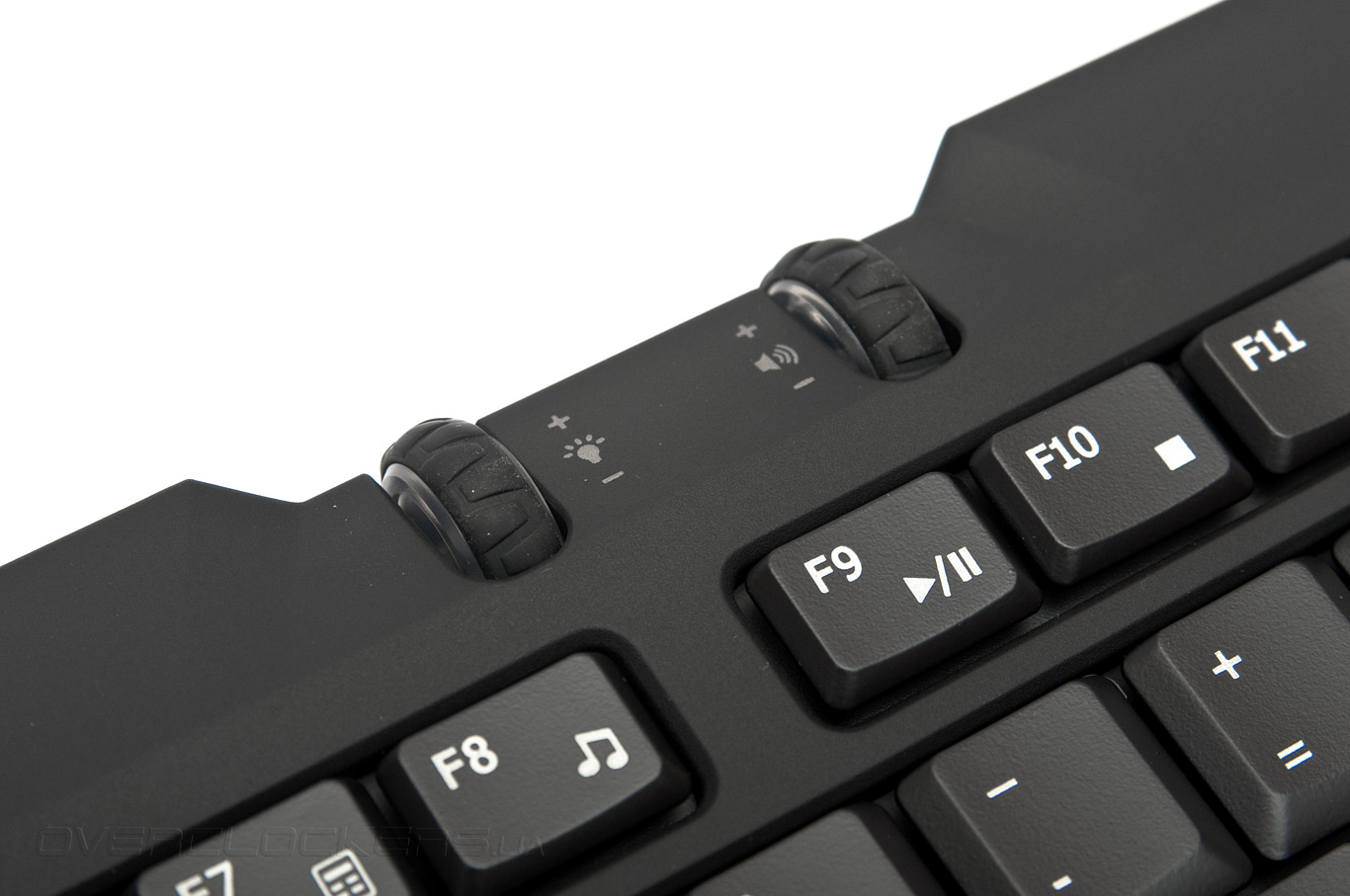Ровно посередине клавиатуры в верхней части находится два прорезиненных колесика, которые можно не только крутить, но и нажимать. Левое колесо отвечает за смену интенсивности подсветки, выбор ее цвета или отключение вовсе. С помощью правого изменяется уровень стандартной громкости Windows, а при нажатии на него звук приглушается полностью. Оба колеса снабжены подсветкой.