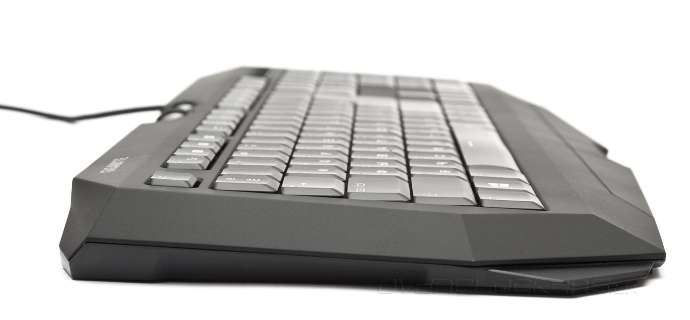 В эксплуатации Gigabyte Force K7 проявляет себя неоднозначно. Начнем, пожалуй, с описания особенностей ножничного механизма. Как уже упоминалось ранее, это по сути своей мембрана, выполненная в виде резиновой чашечки, на которую надет пантограф (ножничный механизм), выполняющий роль амортизатора и направляющих для кнопки. В позитив конструкции можно занести очень точное и равномерно нажатие, небольшую силу активации (порядка 55 г, что соответствует верхнему порогу механических переключателей Cherry MX Brown) и довольно тихий, приглушенный звук срабатывания. Общая дистанция хода такой кнопки составляет 3 мм, причем срабатывает она лишь после преодоления 2 мм, то есть, перед самым ударом о подложку. Негативным моментом с точки зрения игрового применения есть малая информативность нажатия (далеко не всегда получится тактильно отличить момент срабатывания кнопки) низкая устойчивость к механическим повреждениям и невозможность ремонта или замены механизма отдельных кнопок. Даже на коробке есть напоминание о том, что производитель настоятельно не рекомендует отделять крышки от кнопок, поскольку назад они уже не встанут. Второй момент касается надписей. Буквы нанесены яркой краской, которая хорошо различима при свете и в сумерках, но, мягко говоря, не очень устойчива и начинает постепенно стираться уже через месяц использования.
