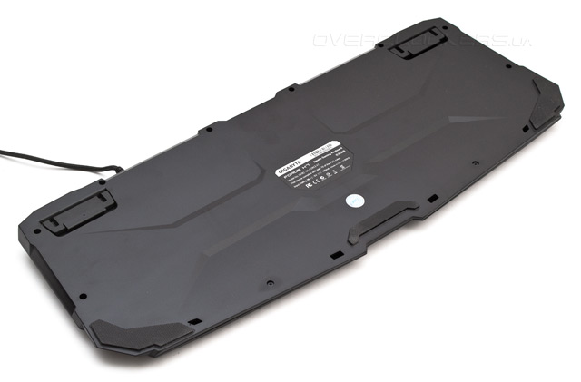 Рифленое дно клавиатуры в купе с большой толщиной и правильно расположенными винтами обеспечивает ей отличную устойчивость к диагональному скручиванию. В руках устройство ощущается как монолитный кусок пластика. На передней грани и по бокам приклеены крупные резиновые ножки, которые обеспечивают хорошее сцепление с поверхностью стола, чему косвенно способствует и значительный вес K7.