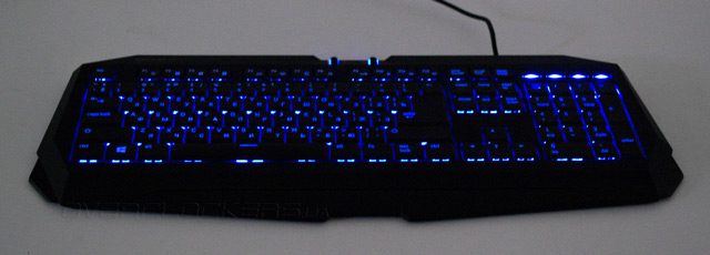 Если абстрагироваться от перечисленных выше проблем, то три варианта подсветки выглядят замечательно. На выбор есть синяя, зеленая или голубая цветовая гамма. Наиболее контрастной, на мой субъективный взгляд, есть зеленая схема подсветки. Нажатие на соответствующее колесико позволяет сменить цвет или выключить свечение полностью. И, что немаловажно, — клавиатура запоминает цвет и интенсивность свечения даже после перезагрузки ПК.