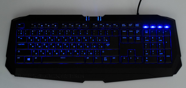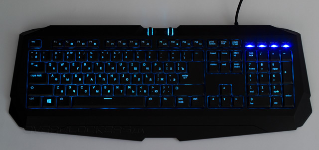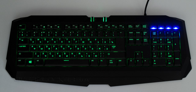 Если абстрагироваться от перечисленных выше проблем, то три варианта подсветки выглядят замечательно. На выбор есть синяя, зеленая или голубая цветовая гамма. Наиболее контрастной, на мой субъективный взгляд, есть зеленая схема подсветки. Нажатие на соответствующее колесико позволяет сменить цвет или выключить свечение полностью. И, что немаловажно, — клавиатура запоминает цвет и интенсивность свечения даже после перезагрузки ПК.