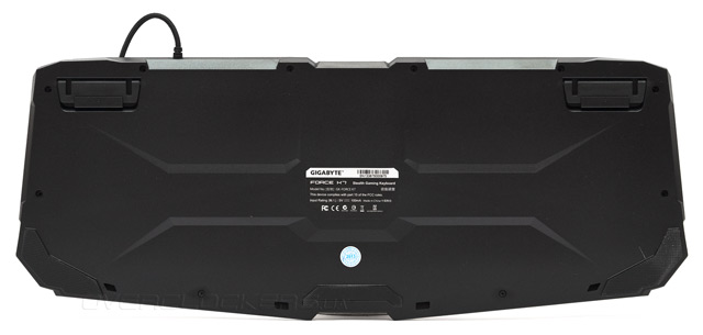 Рифленое дно клавиатуры в купе с большой толщиной и правильно расположенными винтами обеспечивает ей отличную устойчивость к диагональному скручиванию. В руках устройство ощущается как монолитный кусок пластика. На передней грани и по бокам приклеены крупные резиновые ножки, которые обеспечивают хорошее сцепление с поверхностью стола, чему косвенно способствует и значительный вес K7.