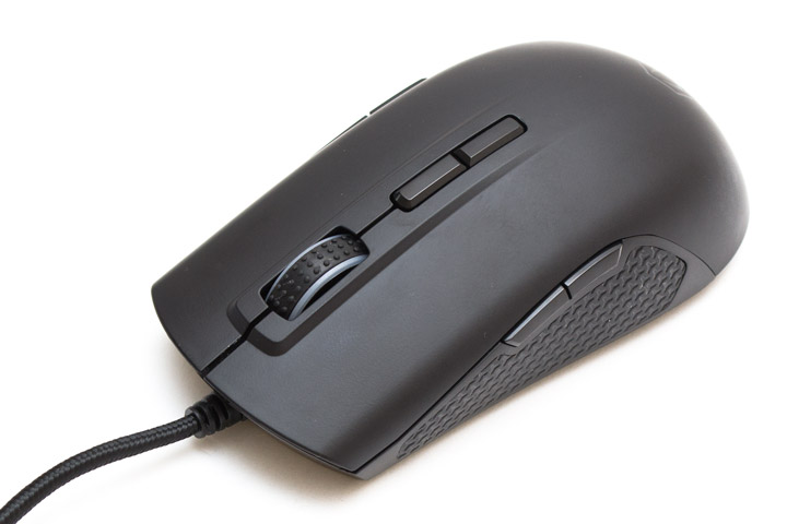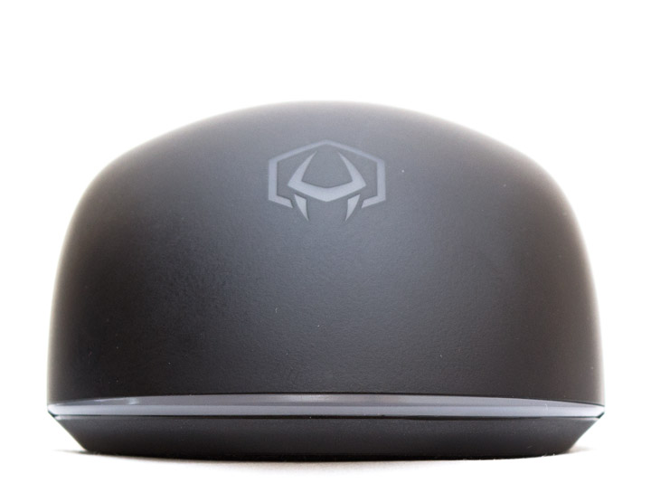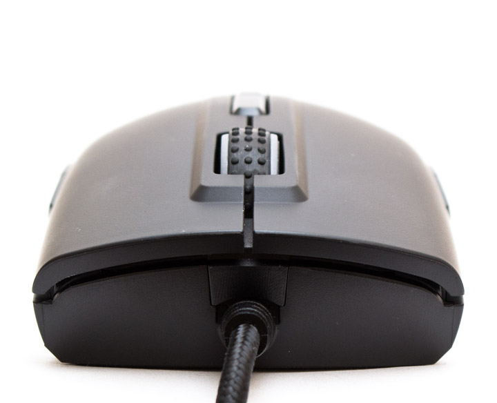 Спереди мышь смотрится неожиданно серьезно. В таком ракурсе становится понятно, почему панели основных кнопок настолько крепкие. Помимо ребер жесткости по бокам и рельефа вокруг колеса прокрутки, передняя часть клавиши представляет собой широкую закругленную полосу, что не оставляет панели никаких шансов на какие-то деформации. Сигнальный кабель заходит в корпус по центру, на достаточной высоте, чтобы избежать трения о поверхность. В месте контакта установлена резиновая защита от перегиба. Колесо прокрутки очень мягкое и тихое. Позиции фиксации едва различимы, что позволяет крутить его с высокой скоростью и без лишнего шума. Обод колеса прорезинен, поверху на нем нанесены насечки в виде трех маленьких кружков, расположенных в ряд.