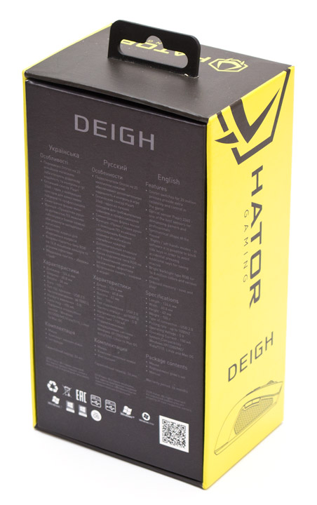 Коробка мыши небольшая и аккуратная. Преобладающими цветами в оформлении является черный и желтый. Продукт показан на фронтальной и боковой стороне в виде контурного рисунка. Технические характеристики приведены сзади, на украинском, русском и английском языках.