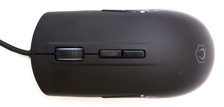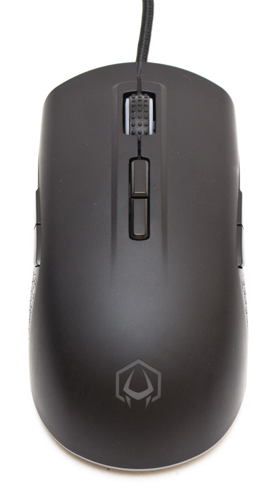 Форма корпуса Hator Deigh довольно специфичная и редко встречается у других производителей. На первый взгляд ее легко спутать с обводами SteelSeries Sensei, но на практике данная мышь оказывается намного ближе к Zowie ZA12, за счет того, что «ладонный» изгиб верхней панели находится не посередине, а смещен ближе к корме. Кроме того, манипулятор сделан нарочито угловатым, если сзади еще можно найти закругление, то панели передних клавиш обрублены спереди и по бокам, а боковины корпуса сделаны ровно вертикальными. В руке, кстати, вся конструкция ощущается достаточно удобной. Из негатива стоит отметить маркость верхней панели, которая очень быстро собирает видимые отпечатки, несмотря на матовый черный окрас. Два самых крупных элемента сверху по центру это глянцевые кнопки переключения разрешения. Они срабатывают мягко, но с хорошо различимым на слух щелчком. Средняя клавиша получилась тугой и громкой, а левая и правая кнопки мыши сбалансированы хорошо и ощущаются средними, как по силе нажатия, так и по громкости активации. Но самое приятное состоит в том, что в них полностью отсутствует люфт и запас свободного хода.