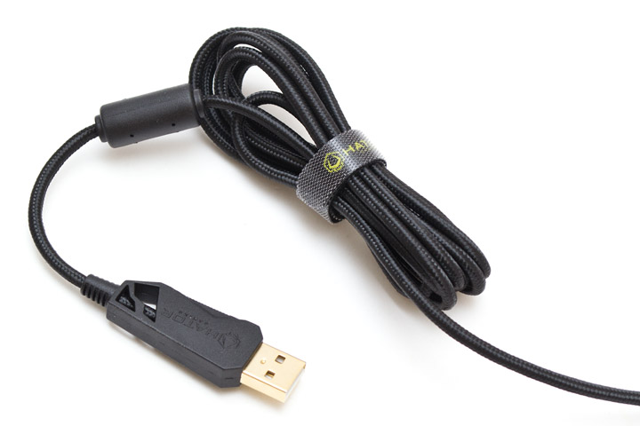 Сигнальный кабель в нейлоновой оплетке имеет среднюю толщину, на ощупь он мягкий, хоть и не очень гибкий, способен поддерживать заданную форму. Длина шнура составляет 1,8 метра. Ферритовое кольцо одето недалеко от разъема USB. Кроме того, тут есть стяжка-липучка, позволяющая собрать лишнюю длину провода.