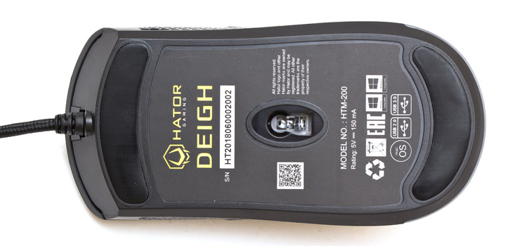 На подошве мыши есть две полукруглые тефлоновые ножки среднего размера впереди и сзади. Оптический сенсор Pixart PMW3360 с инфракрасной подсветкой расположен ровно по центру. Вся остальная площадь основания занята наклейкой с серийным номером.