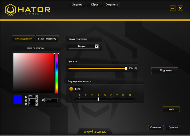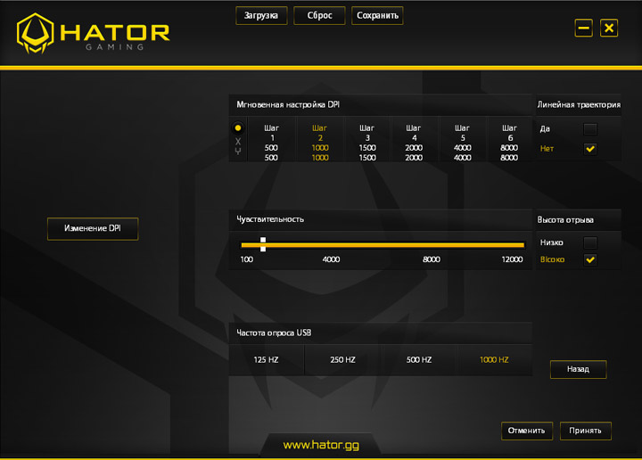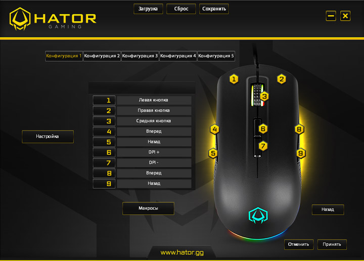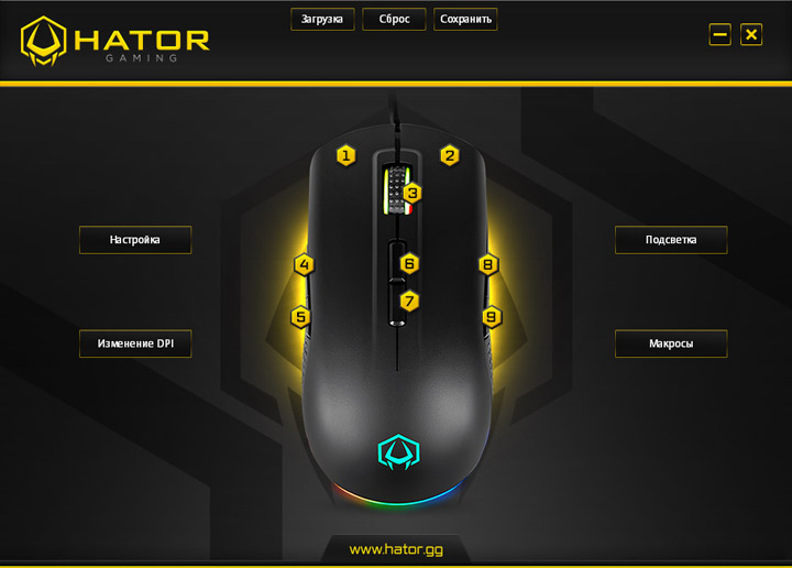В качестве программного обеспечения Hator Deigh использует собственный специфический драйвер (текущая актуальная версия 1.0.0.1), который можно загрузить с официального сайта. Драйвер требует установки и имеет три языка интерфейса, которые можно выбрать только в процессе инсталляции. Программа остается постоянно активной и занимает место в оперативной памяти. На базовом окне доступны варианты сохранения и загрузки текущего профиля на ПК, и сброс мыши на настройки по умолчанию. Кроме того, отсюда можно получить доступ к вкладкам переназначения клавиш, настройкам сенсора, управлению подсветкой и к редактору макросов.