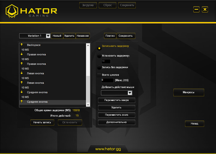 Макроредактор выполнен слегка странно. В нем можно записывать клавиатурные команды, в то время как нажатия мыши не регистрируются прямо. Для них требуется добавлять нажатия ЛКМ, СКМ и ПКМ через контекстное меню. Есть настройки задержек, в целом можно записать до 58 символов в одну команду. Каждому макросу можно присваивать индивидуальное название, сохранять его, загружать, удалять и редактировать.