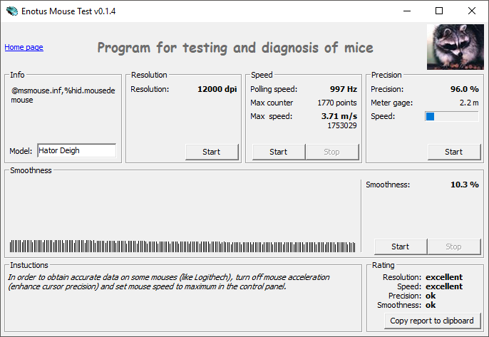 В настройках сенсора можно регулировать шесть уровней разрешения в пределах от 100 до 12 000 cpi с шагом 100 cpi. Есть возможность раздельно управлять разрешением по оси X и Y. Кроме того, есть выключатель линейности траектории. Высота отрыва (LOD) выставляется лишь в пределах значений «низко» и «высоко», что соответствует значениям в 2 и 3 мм, хотя данная модель сенсора способна на поддержку и более низких значений. На выбор есть четыре традиционные частоты опроса в 125, 250, 500 и 1000 Гц.