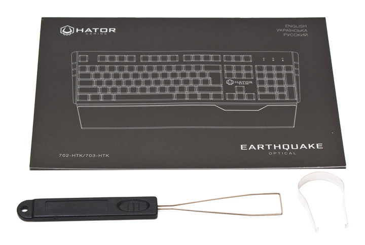В комплекте поставки есть подробная инструкция на трех языках, ключ для демонтажа колпачков клавиш и ключ для снятия механизмов.