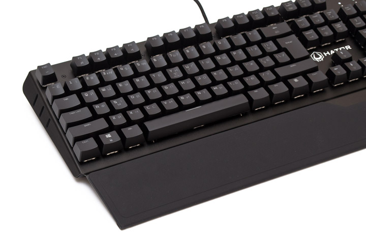 Удобство клавиатуры Hator Earthquake — это то, что влюбляет в себя с первых минут работы. Клиновидный корпус из металла, с жестко интегрированной и приподнятой подставкой под ладони на самом деле является сочетанием, которое встречается у современных производителей крайне редко. Само по себе устройство очень прочное, и в то же время относительно легкое, в сборке корпуса нет зазоров или люфтов. В случае загрязнения все колпачки клавиш легко снимаются и поверхность металла достаточно протереть слегка влажной тряпочкой. За стол клавиатура держится отлично, независимо от того, сложены ножки или развернуты. Лично мне больше понравился вариант с развернутыми ножками. Резиновая подставка под ладони, закрепленная поверх металла — тоже интересное решение. Рука не скользит и не запотевает, степень жесткости покрытия оптимальная. Кроме того, мягкий кабель не мешает ничему на столе и позволяет легко перемещать устройство, если возникает такая необходимость.