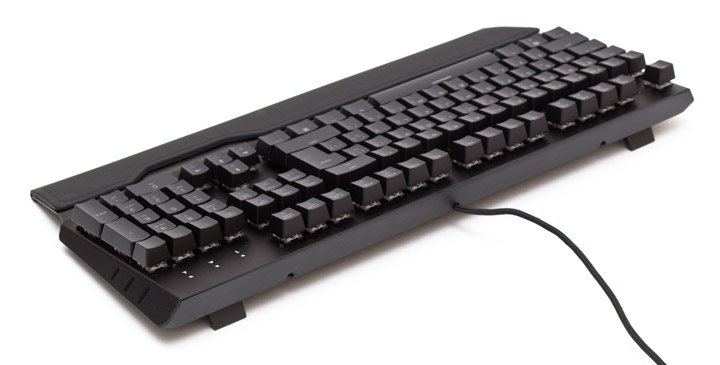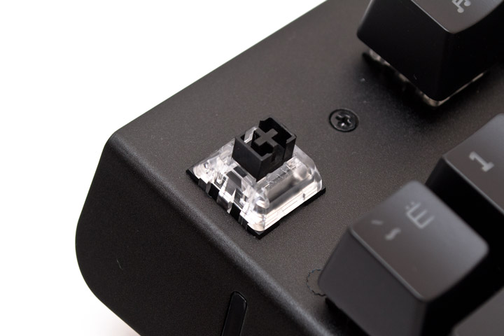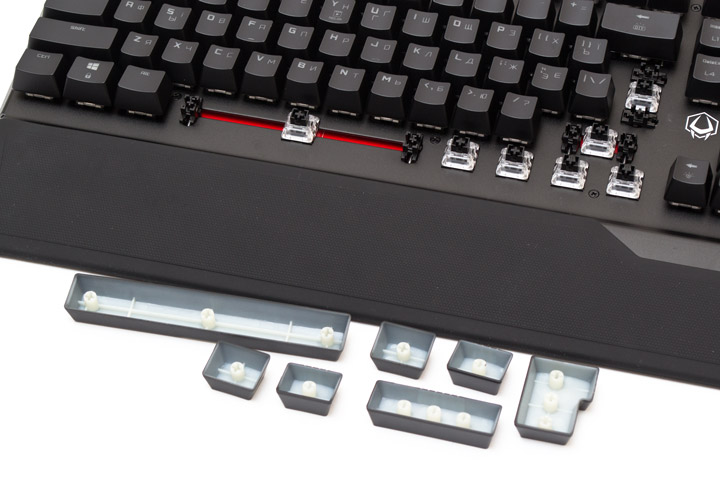 Перейдем к самому интересному, а именно — к типу используемых тут переключателей. Под кнопками находятся Kailh Optic Linear, которые по внешнему виду больше похожи на обычную механику, чем, например, Razer Opto-Mechanical. Они вполне совместимы с обычными колпачками от Cherry MX, хотя вокруг нажимного штифта установлены дополнительные опорные стенки в виде квадрата с прорезями посередине. Стабилизаторы длинных клавиш внутренние, что очень хорошо, поскольку позволяет легко и быстро снимать колпачки для очистки. Сами кнопки сделаны из окрашенного с одной стороны ABS-пластика. По части стабилизации тут все не очень, почти все клавиши, и короткие, и длинные имеют ощутимый люфт по горизонтали.