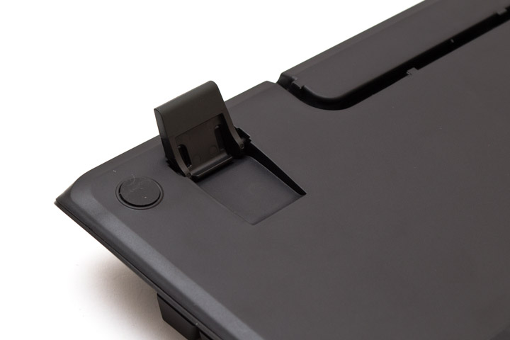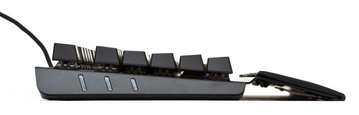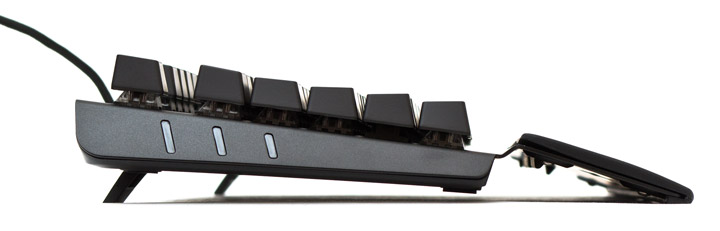На металлических, треугольных в профиль и наклонных боковинах с каждой стороны есть по три пластиковые декоративные вставки. Длинная ладонная подставка имеет изгиб, благодаря которому руки всегда слегка приподняты над клавиатурой, независимо от угла ее наклона. Когда ножки свернуты, весь корпус устройства лежит на поверхности. Когда развернуты — высота задней части корпуса возрастает до 52 мм и он опирается на ножки и прорезиненную переднюю грань подставки.