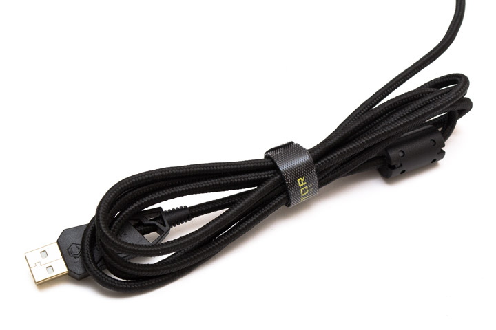 Кабель клавиатуры в нейлоновой оплетке имеет длину 1,8 метра, недалеко от USB-разъема на провод надето ферритовое кольцо для устранения помех. Кроме того, тут есть липучка, с помощью которой можно свернуть лишнюю длину провода. Сам кабель средний по толщине и достаточно гибкий. В то же время он хорошо поддерживает заданную форму.