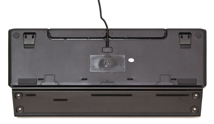 Основание клавиатуры пластиковое. В задней части есть канал для укладки кабеля в трех направлениях, по углам наклеены резиновые ножки. Наклейка с серийным номером отсутствует, так как перед нами семпл. Снизу есть четыре водосточных отверстия, что наводит на мысль про вероятную устойчивость к пролитию жидкости, хотя официально производитель это не декларирует. Кроме того, возле передних ножек присутствуют характерные заглушки отверстий крепления ладонной подставки, которая, возможно, изначально планировалось съемный. Порадовал меня и способ крепления резиновой накладки под ладони. Никакого клея, только жесткая фиксация за металл четырьмя винтами и таким же количеством Т-образных резиновых зацепов. Кстати, передняя кромка подставки обернута резиной и работает в качестве ножки, когда клавиатура приподнята.