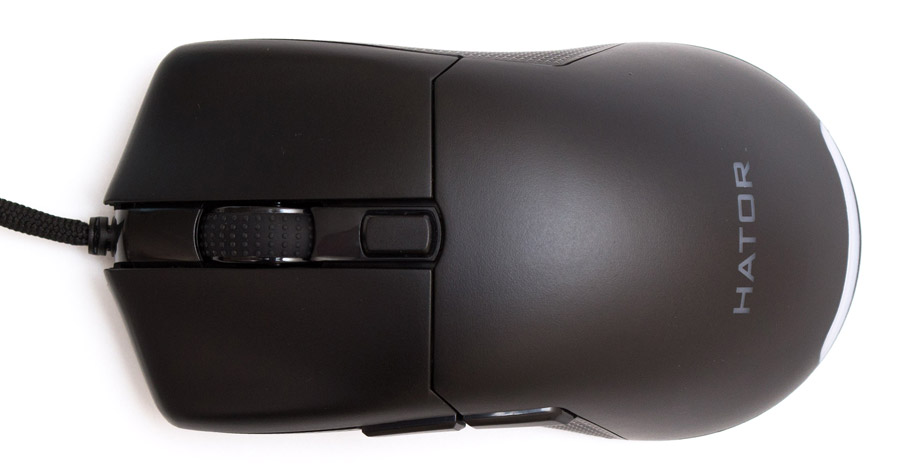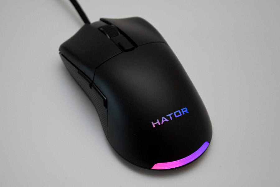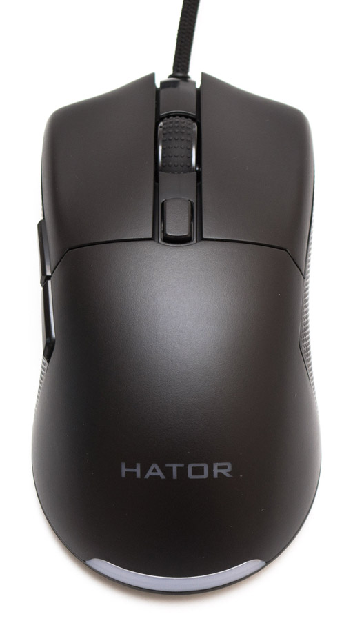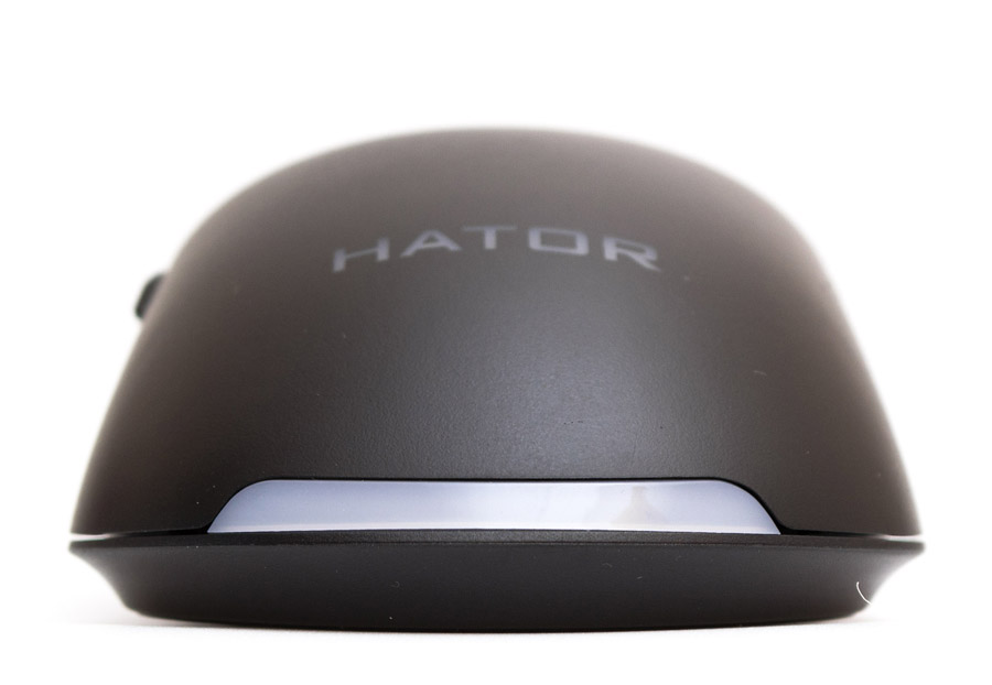 На корме мыши есть надпись Hator (вместо фирменного логотипа) и полоса полупрозрачного пластика снизу. Это одна общая зона подсветки.