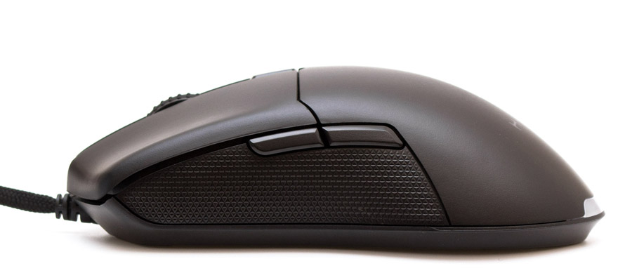 Левая боковина мыши пластиковая, с цепкой текстурой в виде миниатюрных треугольников. Две боковые дополнительные клавиши заметно выступают над поверхностью. Имеют очень большой запас свободного хода до срабатывания. Издают отчетливый звук щелчка и требуют среднее усилие для активации. В качестве переключателей под этими клавишами установлены механизмы Kailh.