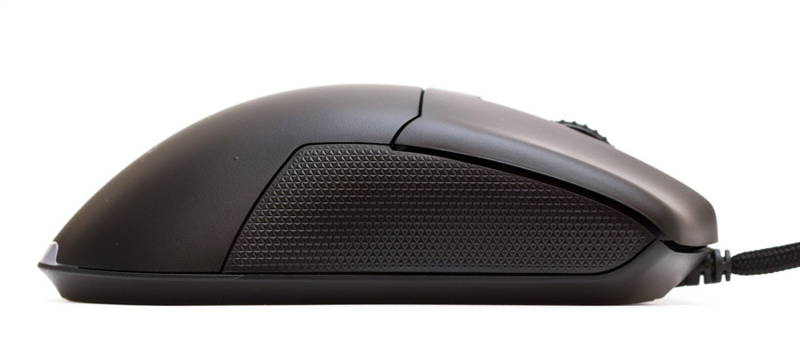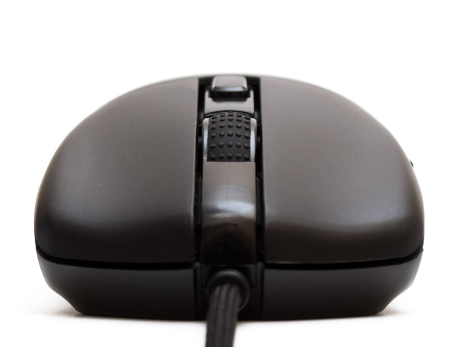 Кабель заходит в корпус мыши посередине, на небольшой высоте от поверхности и имеет короткую защиту от перегиба. Движениям мыши он не мешает. Колесо прокрутки прорезинено и покрыто точечными тактильными насечками, расположенными по пять штук в ряд. Вращается легко, с небольшим потрескиванием. Тактильная отдача при отработке позиций фиксации слабая. В качестве энкодера здесь используется механизм F-Switch.