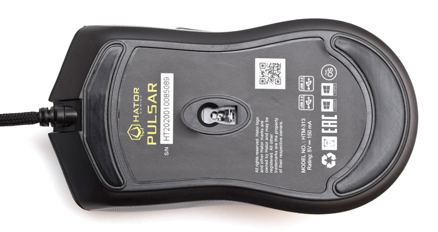 На основании мыши есть две полукруглые ножки впереди и сзади. Ровно по центру расположено окошко сенсора PixArt PMW3389 со встроенной инфракрасной подсветкой.