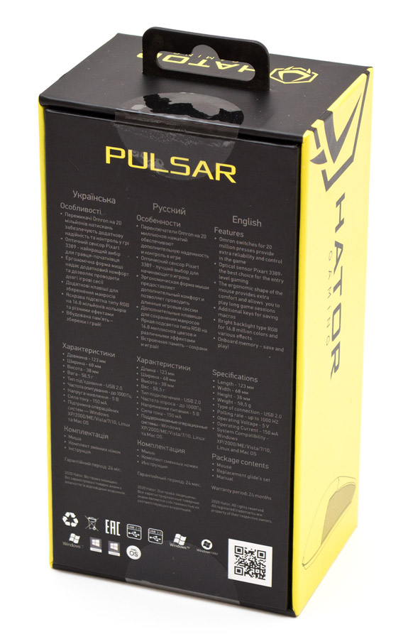 Мышь поставляется в розничную продажу в простой черно-желтой коробке. Впереди есть схематическое изображение устройства, а в тыльной части расписаны его технические подробности.