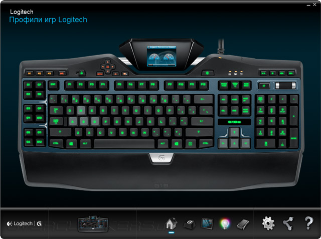 Со времён тестирования модели G710+, интерфейс LGS не претерпел конкретных изменений. Помимо изображений подключенной периферии Logitech, в нижнем левом углу окна программы есть восемь разделов: «Главное», «Настройка G-клавиш», «Настройка ЖК-экрана», «Настройка цвета подсветки», «Профили для переноса», «Настройки», «Поделиться» и «Справка». Первые пять вкладок основные, и представляют особый интерес для пользователей. Остальные три более информативные и существенной пользы не привносят.