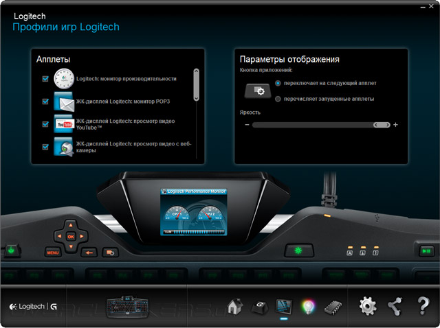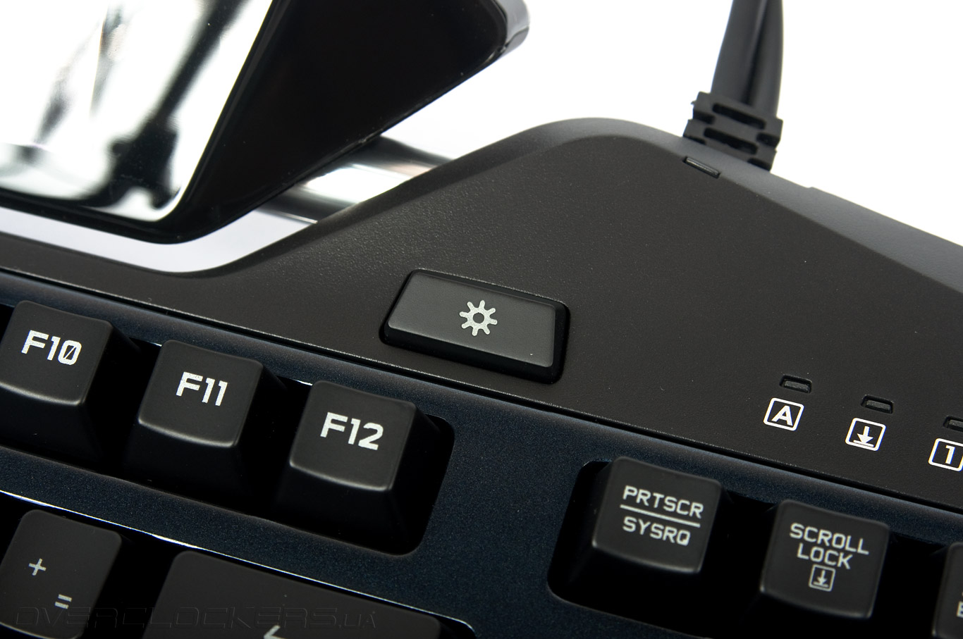 Регулятор подсветки помещен справа от ЖК-дисплея. Механизм его работы сводится лишь к включению/отключению подсветки и дисплея. Поуровневая настройка яркости свечения диодов выполняется только через ПО Logitech Gaming Software.