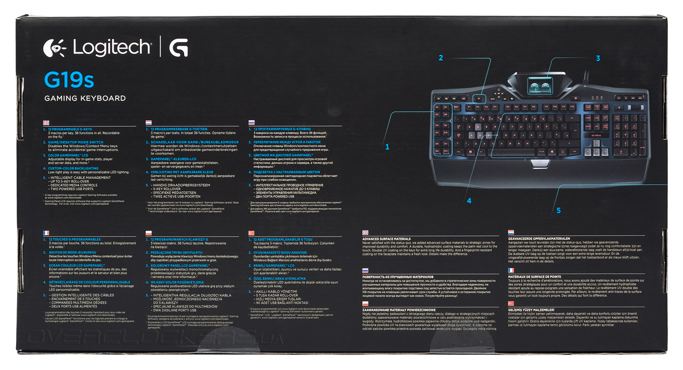 Logitech G19s оснащена эффектной подсветкой, включающей в себя набор из 16 млн. оттенков. Под каждым элементом управления находятся отдельные светодиоды.
