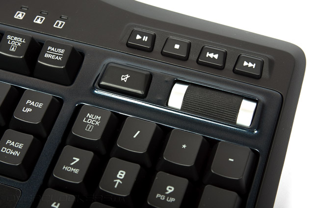 Над цифровым блоком находятся мультимедиа-кнопки, позволяющие перелистывать треки вперед/назад, включать/отключать воспроизведение и полностью приглушать звук. Регулятор громкости выполнен в виде прокручиваемого барабана. Благодаря средней скорости прокрутки и очень плавному ходу пользователь может точно отрегулировать уровень громкости. Прорезиненный обод с множеством горизонтальных делений приятный в тактильном плане.