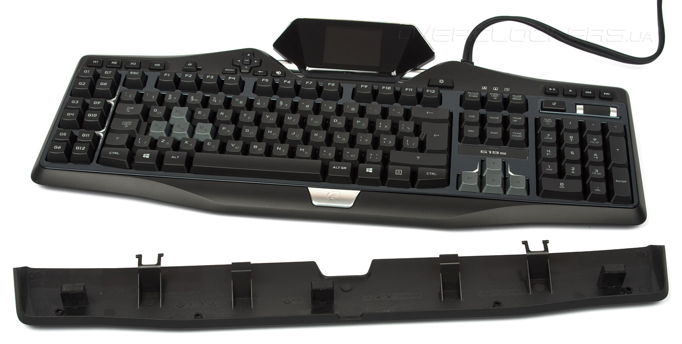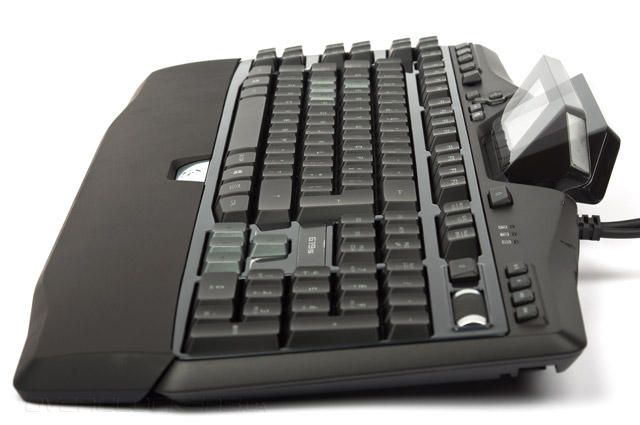 Познакомившись поближе с Logitech G19s нам стало понятно, почему производитель акцентирует особое внимание на так называемых «улучшенных» материалах. Гидрофобное покрытие на подставке под запястья гораздо приятнее при прикосновении, чем обычный матовый пластик. Прочный пластик в основании корпуса служит надёжной базой для крепления всех остальных элементов. Боковые стыки пластмассовых пластин подогнаны идеально. Явных люфтов на тестируемом экземпляре замечено не было.