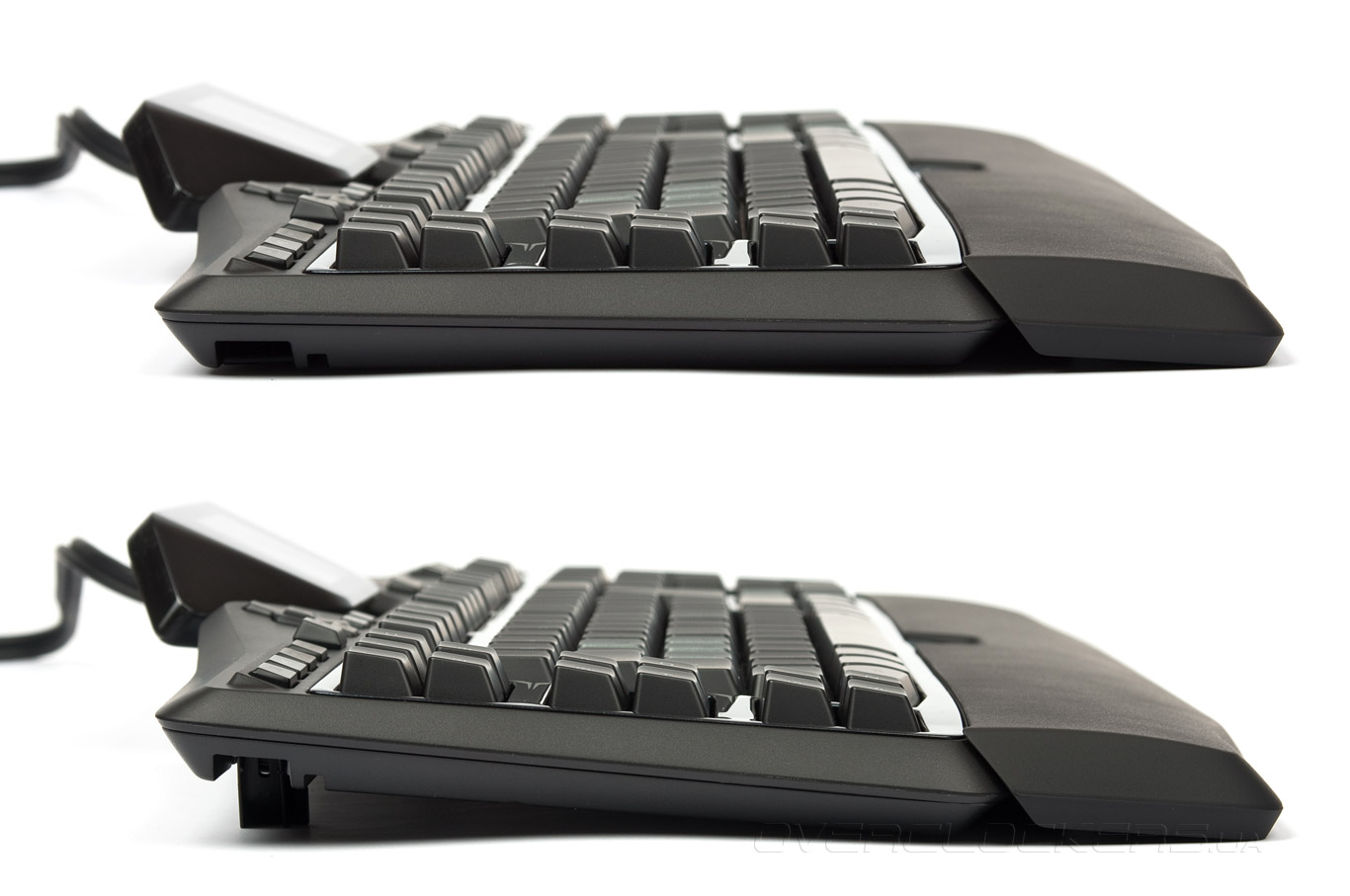 Края корпуса закруглены с обеих сторон. В верхней части расположен ЖК-дисплей и всевозможные переключатели, за счет чего увеличились размеры верхней панели. То же самое касается и левой стороны, удлинённой за счёт двух вертикальных рядов программируемых G-клавиш. Габариты устройства без подставки под запястья составляют 50х22,6х2,1 см, с подставкой — 50х26,5х2,1 см.