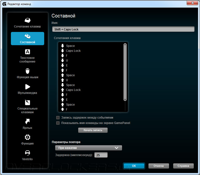 - «Составной» — назначение последовательности сочетаний клавиш в виде макроса с учетом временных задержек;