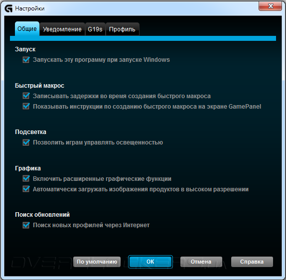 Раздел «Настройки» сочетает в себе общие настройки, такие как: включение расширенных графических функций, поиск новых профилей в интернете, работа с макросами, уведомления об активации пресета / изменения DPI на экране GamePanel и т.д.