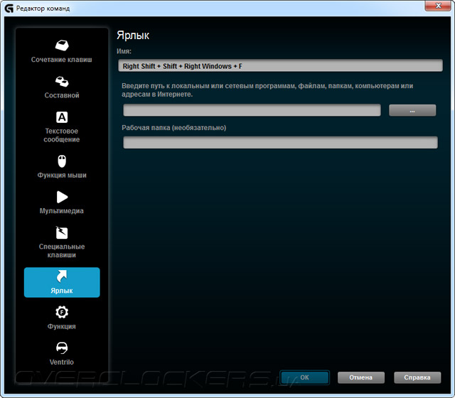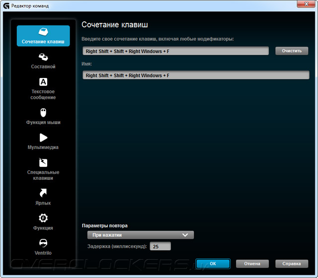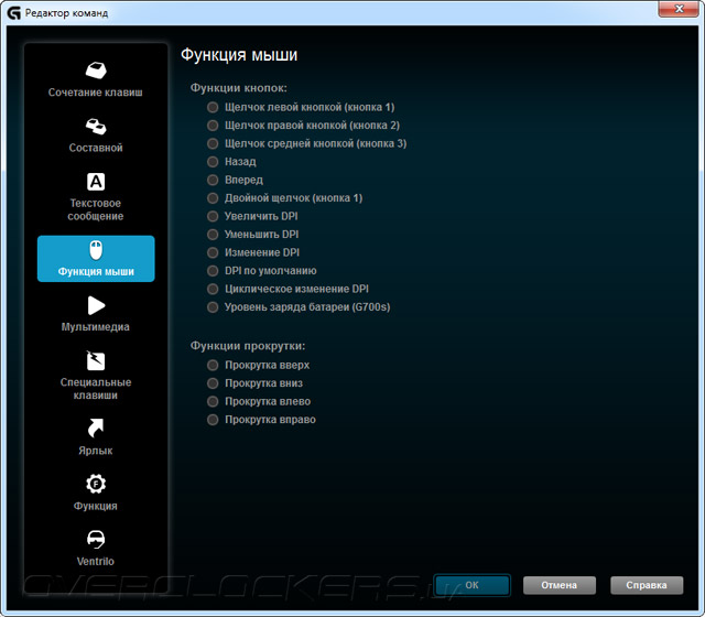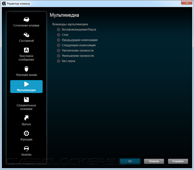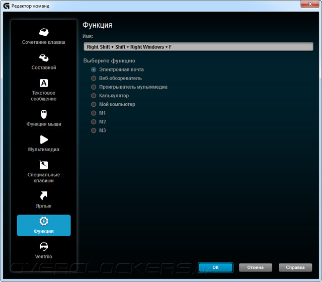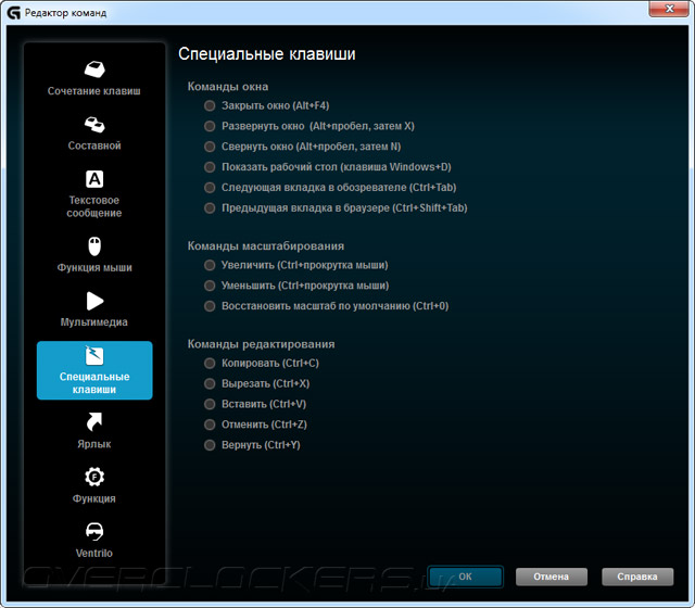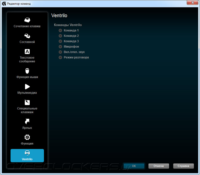 Для назначения действия любой клавише следует воспользоваться редактором команд, в котором функции разделены на несколько подразделов: «Сочетание клавиш», «Составной», «Текстовое сообщение», «Функция мыши», «Мультимедиа», «Специальные клавиши», «Ярлык», «Функция» и клиент Ventrilo. Функции следующие: