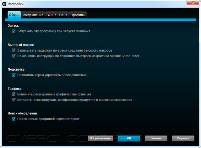 Вкладка «Настройки» сочетает в себе общие настройки, такие как: автоматический запуск ПО LGS при загрузке Windows, уведомления об активации пресета, включение расширенных графических функций, работа с макросами, поиск обновлений и т.д.